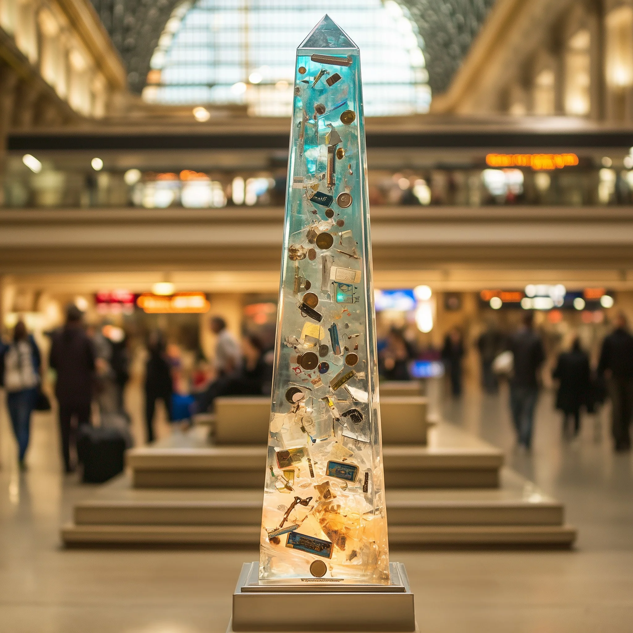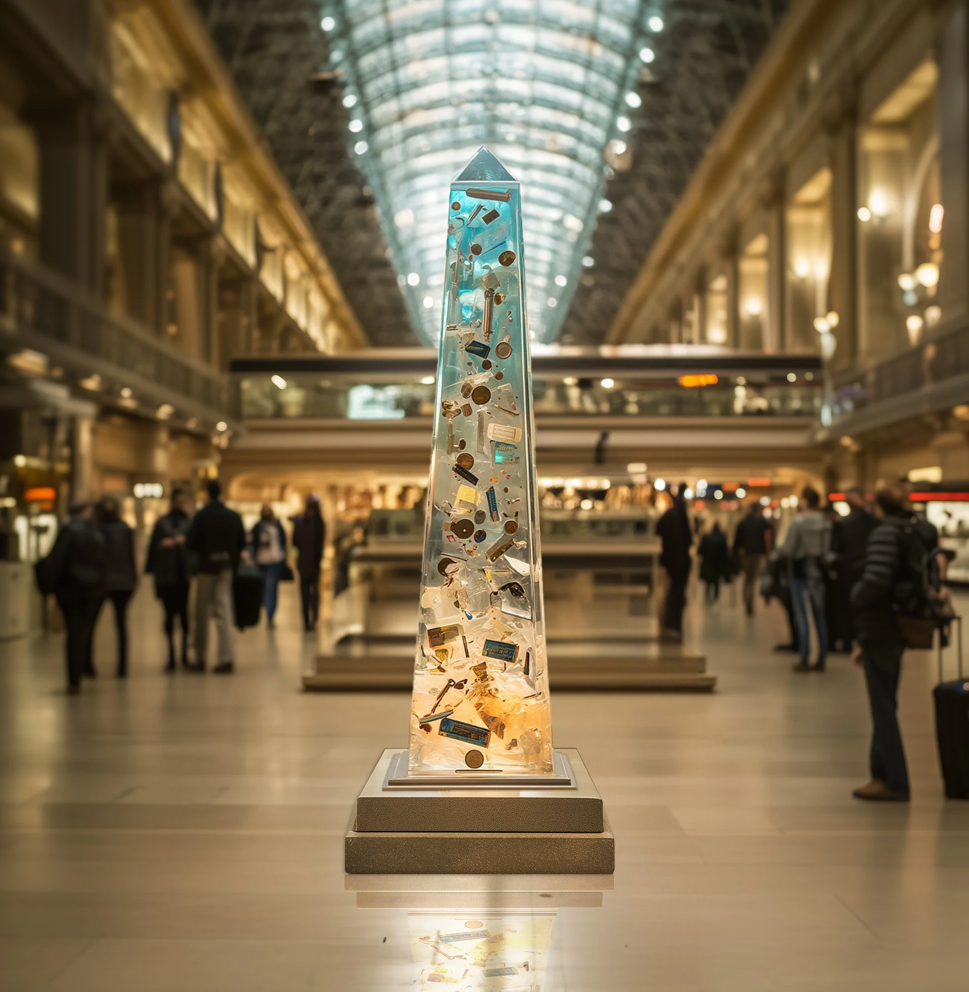 This installation is a 2.4-meter-tall resin obelisk filled with objects left behind by train passengers, each encapsulating a story of transience and human connection. Designed for the Union Station group exhibit at DesignTO 2025, the piece reflects the fleeting nature of travel while transforming forgotten items into a permanent, reflective monument. The obelisk’s transparency and subtle color tint interact dynamically with light, creating an evolving visual experience that invites viewers to pause and reflect amidst the rush of urban life.